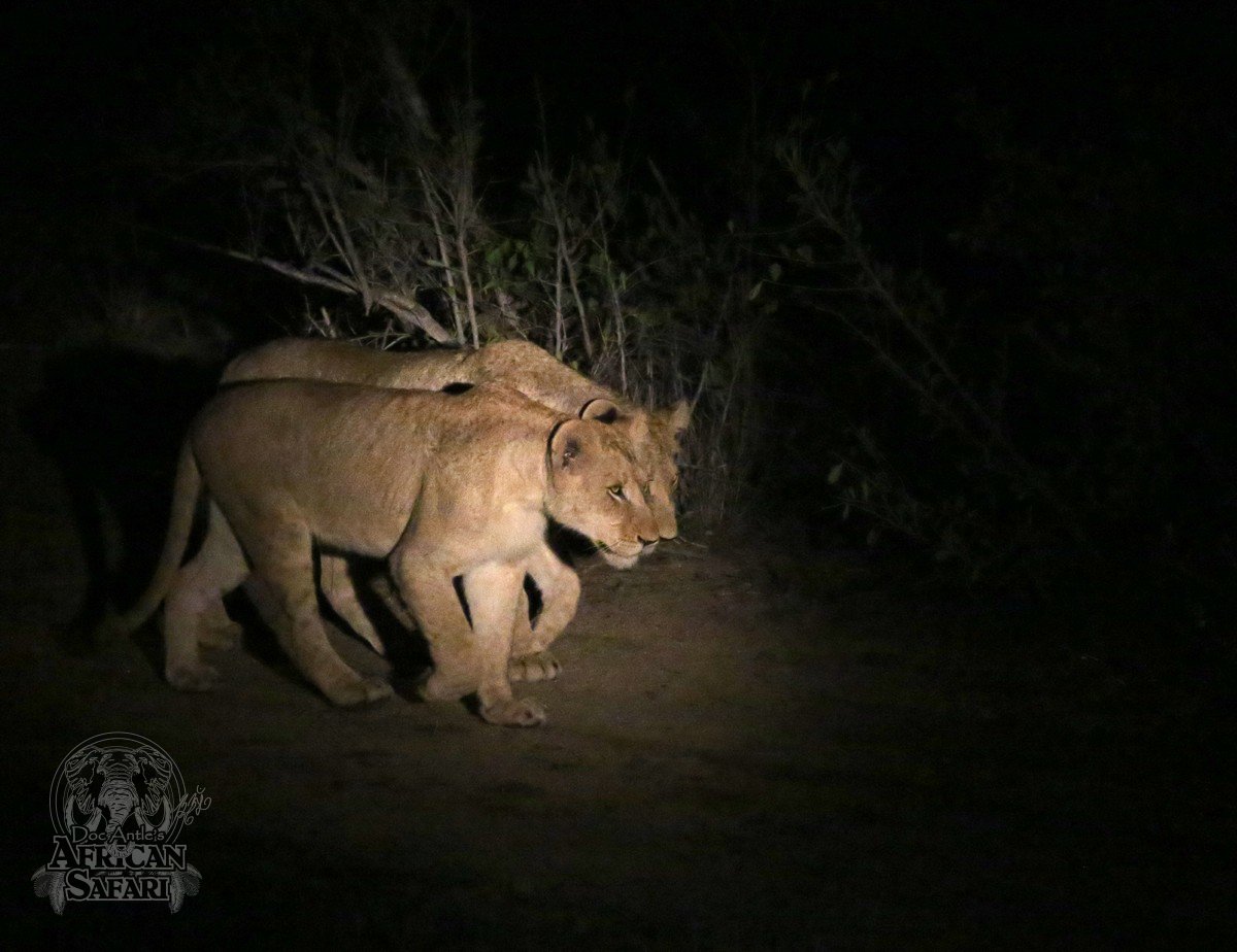 Lions prey mainly on large animals such as Zebra, Wildebeest, Buffalo, Gemsbok and even Giraffe. Smaller prey like Impala, Steenbok and even Porcupine are taken when the opportunity arises. The task of hunting is often left to the lionesses of the pride, which hunt as a team.